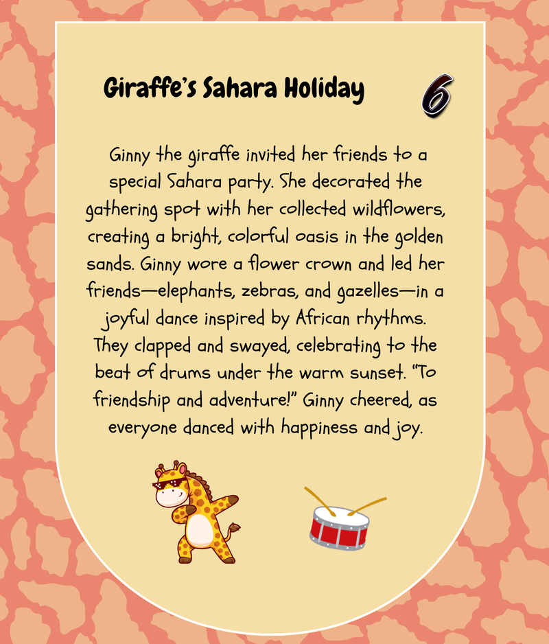 In this beautifully illustrated tale, a group of animal friends – including a curious bear, a clever rabbit, a gentle elephant, and,giraf, lion, tiger, deer ,riender,monkey or wise fox– go on a holiday adventure through the jungle, shahara, autumn falling and snow mountains. Along the way, enjoying each other, and discover the true meaning of joy and sharing.